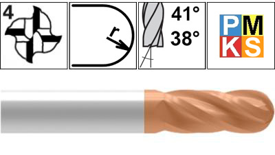 Сферические фрезы серии P4S-BNS применяются для профильной обработки в материалах : сталь, нержавеющая сталь, чугун, жаропрочные сплавы. В линейке представлены 4-зубые твердосплавные фрезы с полными радиусом, диаметром от 3 до 20 мм, угол подъема спирали 41° и 38°.