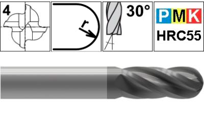 Сферические фрезы Schwarzmaier серии PMK13 применяются для профильной обработки в материалах твердостью до 55 HRC: Сталь (P), Нержавеющая сталь (M), Чугун (K). В линейке представлены 4-зубые твердосплавные фрезы с полным радиусом, диаметром от 4 до 20 мм, угол подъема спирали 30°. Защитное покрытие BALINIT® FUTURA NANO (TiAlN) увеличивает износостойкость режущего инструмента и срок его службы.